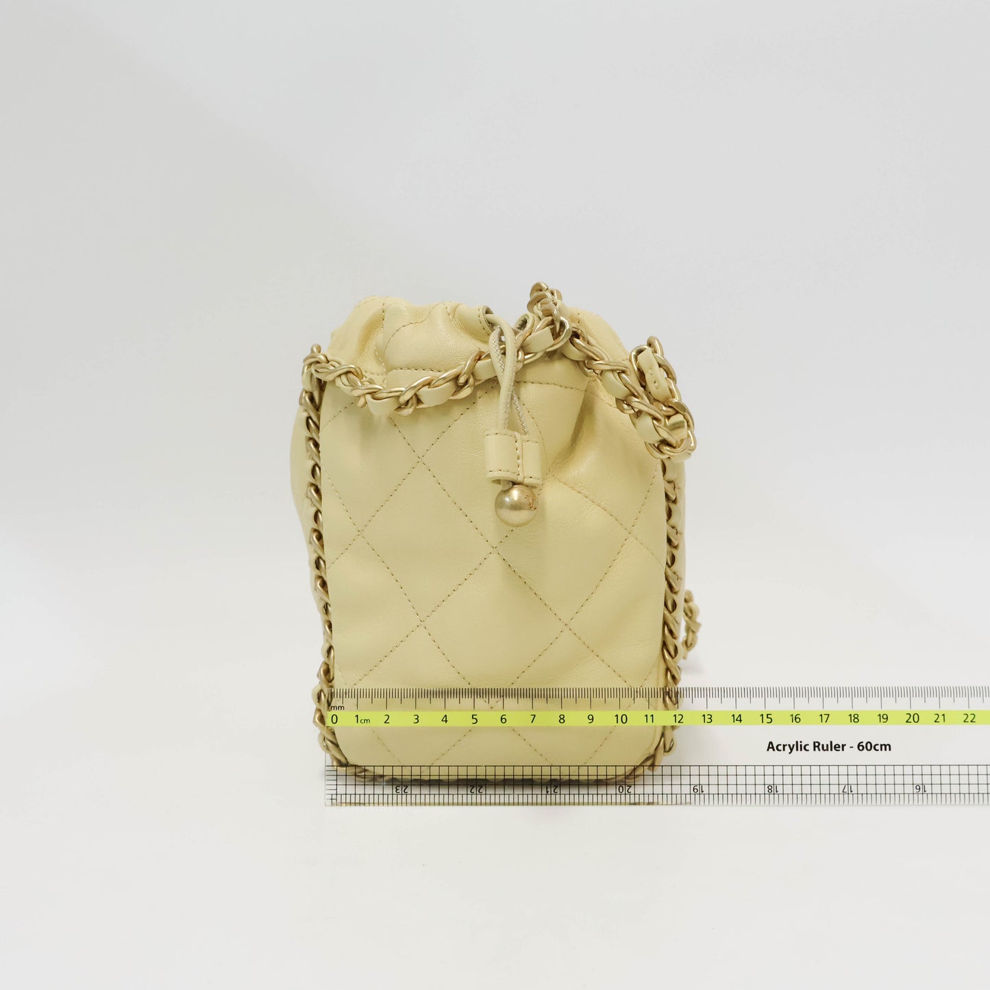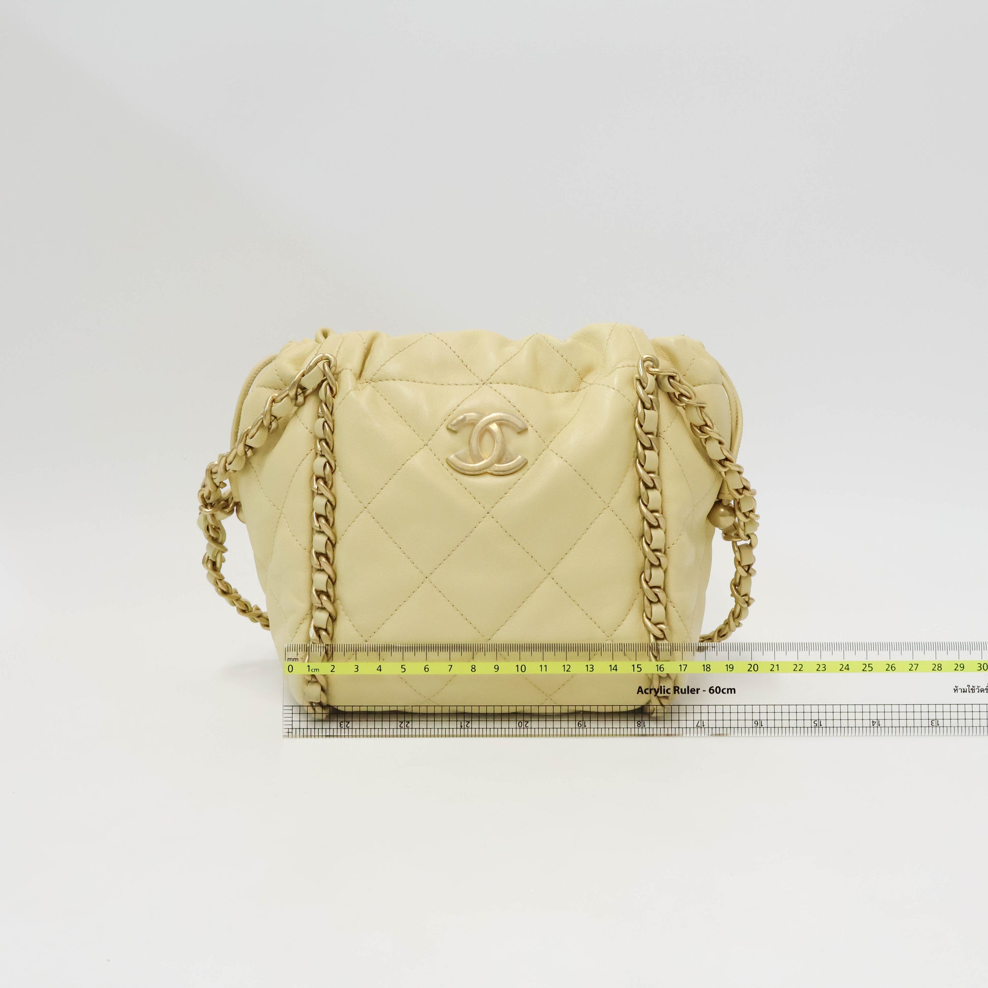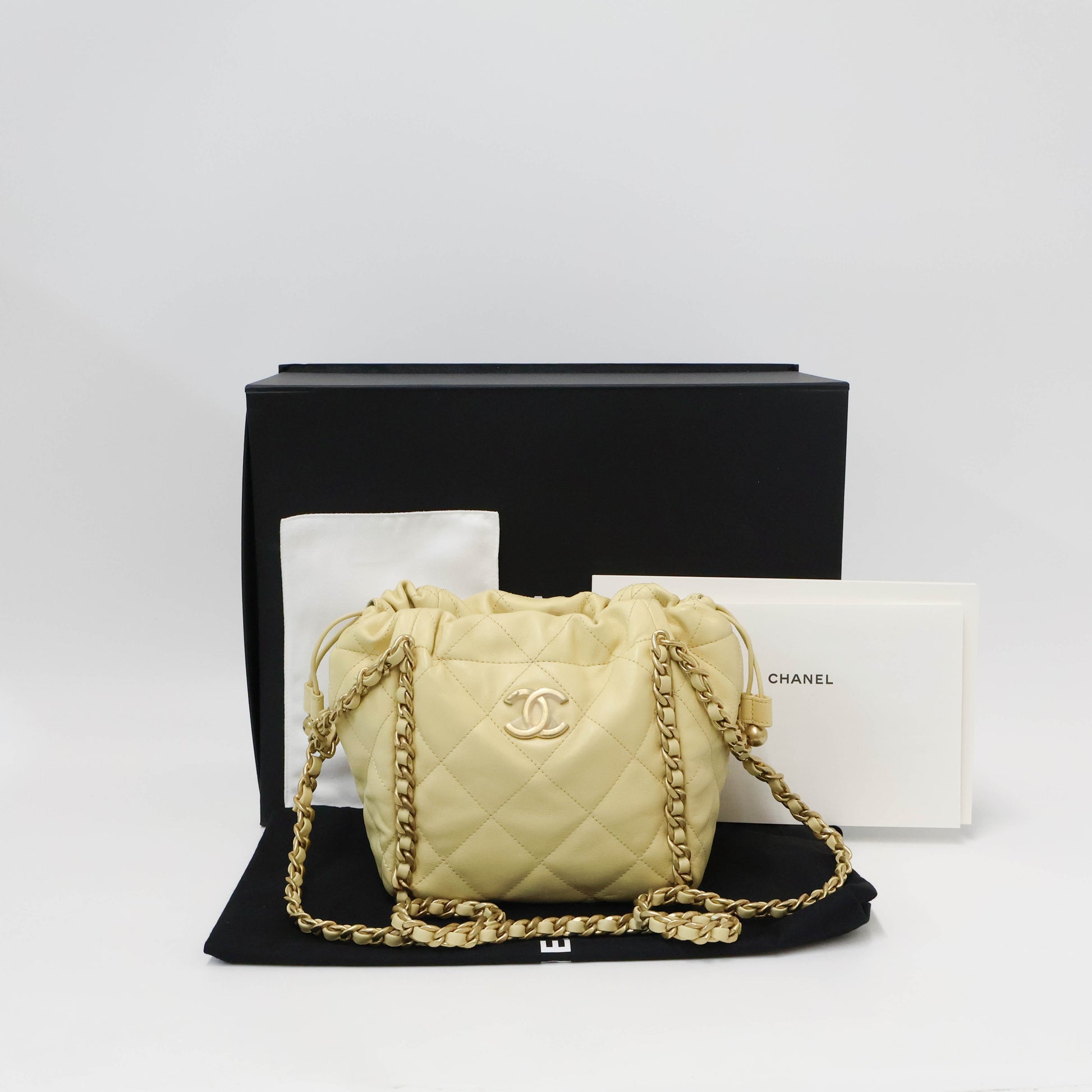 Introducing the must-have Chanel Bucket Bag in stunning light yellow with gorgeous gold hardware! This statement piece is the perfect accessory for any outfit and is sure to turn heads. With its spacious interior and iconic design, you'll never want to leave home without it. Elevate your style and make a statement with this luxurious bag.