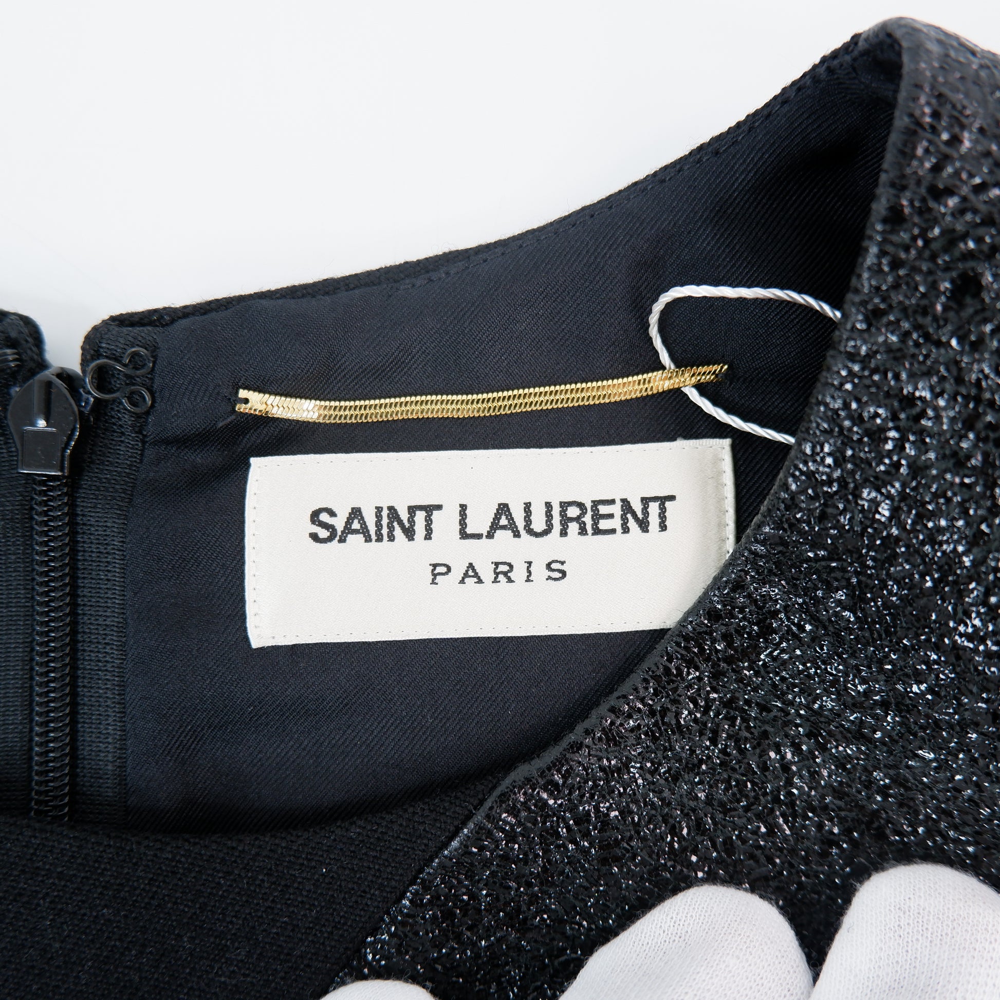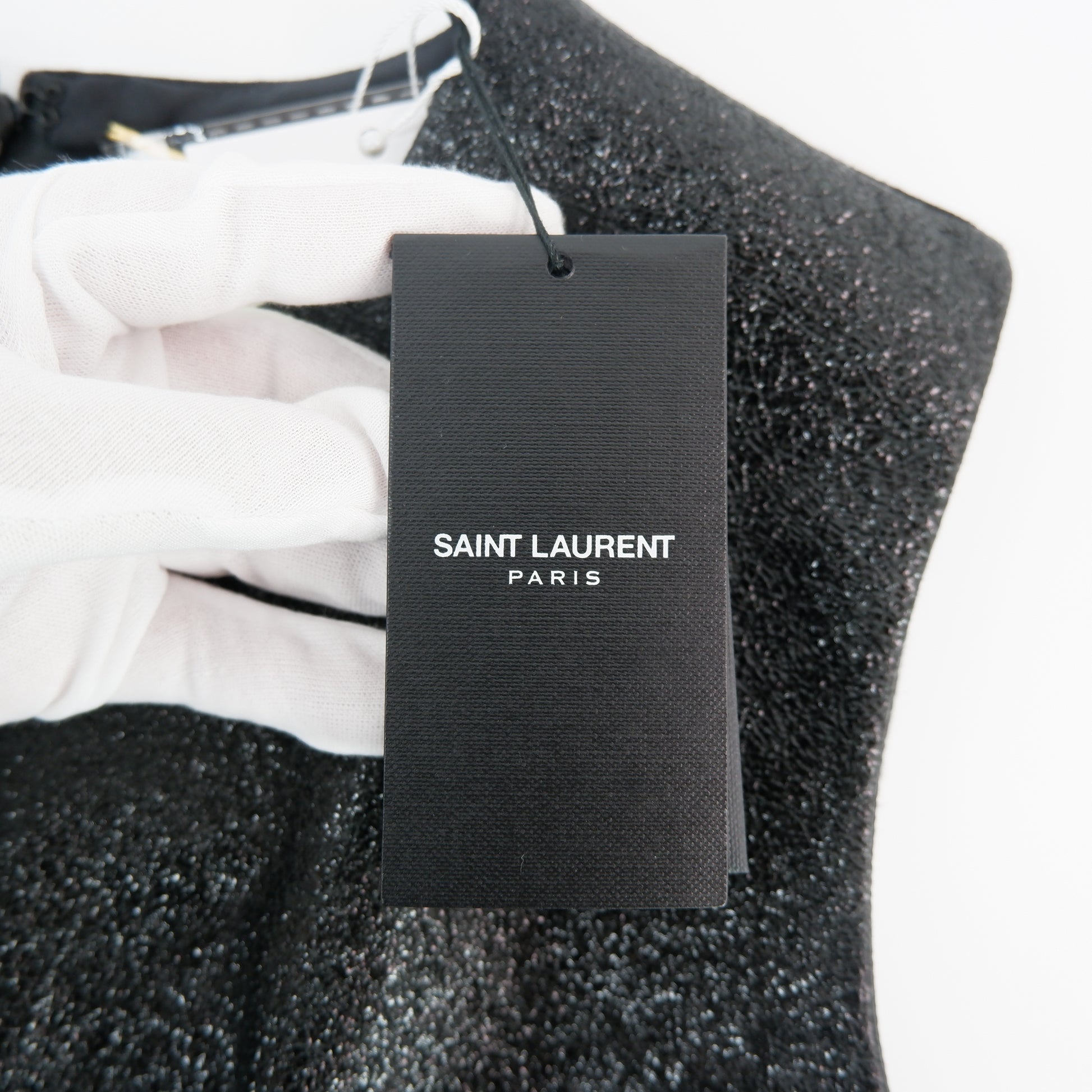 Introducing the Saint Laurent Dress in stunning black metallic. Elevate your style with this sleek and chic piece, perfect for a night out or a special occasion. With its shimmering fabric and flattering silhouette, this dress is sure to make you look and feel like a true fashion icon. Experience luxury and radiate confidence in the Saint Laurent Dress.